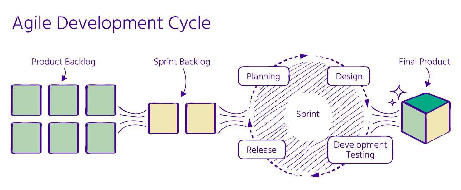 [Ketterän kehitysprosessin](https://www.ariadgroup.com/en/blog/all-about-scrum-Agile/details-about-scrum-Agile-components) sisältää useita keskeisiä käytäntöjä. Ensinnäkin on "tuotejonon" eli vuoden aikana haluttujen ominaisuuksien ja tehtävien luettelo. Sitten joka kuukausi sinulla on "sprintin jonon", joka on tehtävälista kyseisen kuukauden aikana työstettäväksi. Ketterä sykli tapahtuu säännöllisesti, yleensä joka toinen viikko tai kerran kuukaudessa, tiimin päätöksen mukaan, ja se sisältää vaiheet kuten suunnittelu, suunnitelma, kehittäminen, testaaminen ja ohjelmiston julkaisu. Tämä sykli toistuu, jossa jokainen sprintti ammentaa sprintin jonosta, ja se johtaa lopputuotteen toimittamiseen.