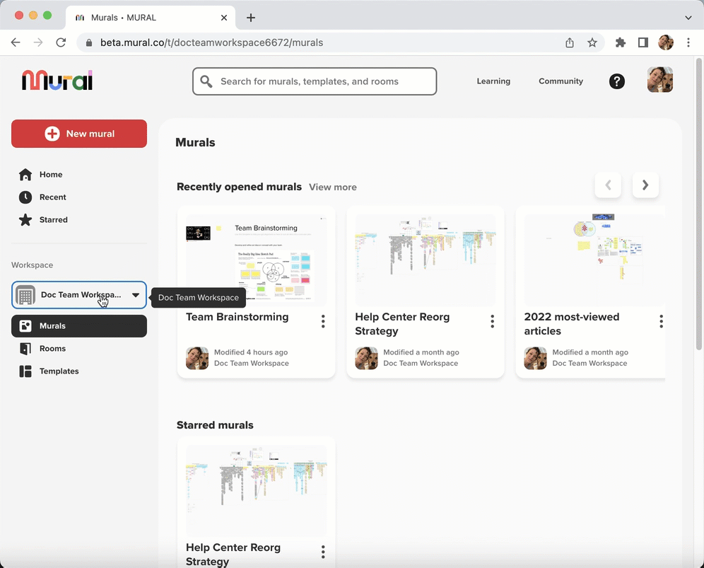 Kuten yllä mainittiin, jokaisessa työtilassa voi olla useita erilaisia huoneita (avoin, yksityinen tai luottamuksellinen) sekä kansioita projektin tai tiimin [rakenteen](https://support.mural.co/s/article/introduction-to-mural-s-structure) mukaisesti.
