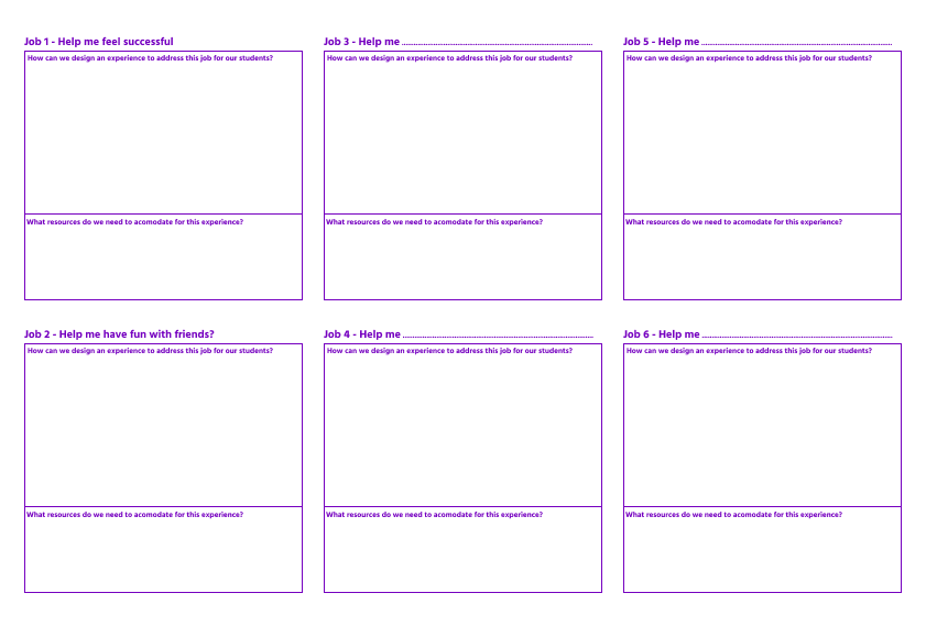 * **Listaa tarvittavat kokemukset**: Määritä jokaiselle 'tehtävälle joka täytyy tehdä' erilaisia tarvittavia kokemuksia. Näihin saattaa kuulua mentorointi, opiskelijoiden toimijuuden edistäminen tai merkityksellisten työkokemusten luominen.